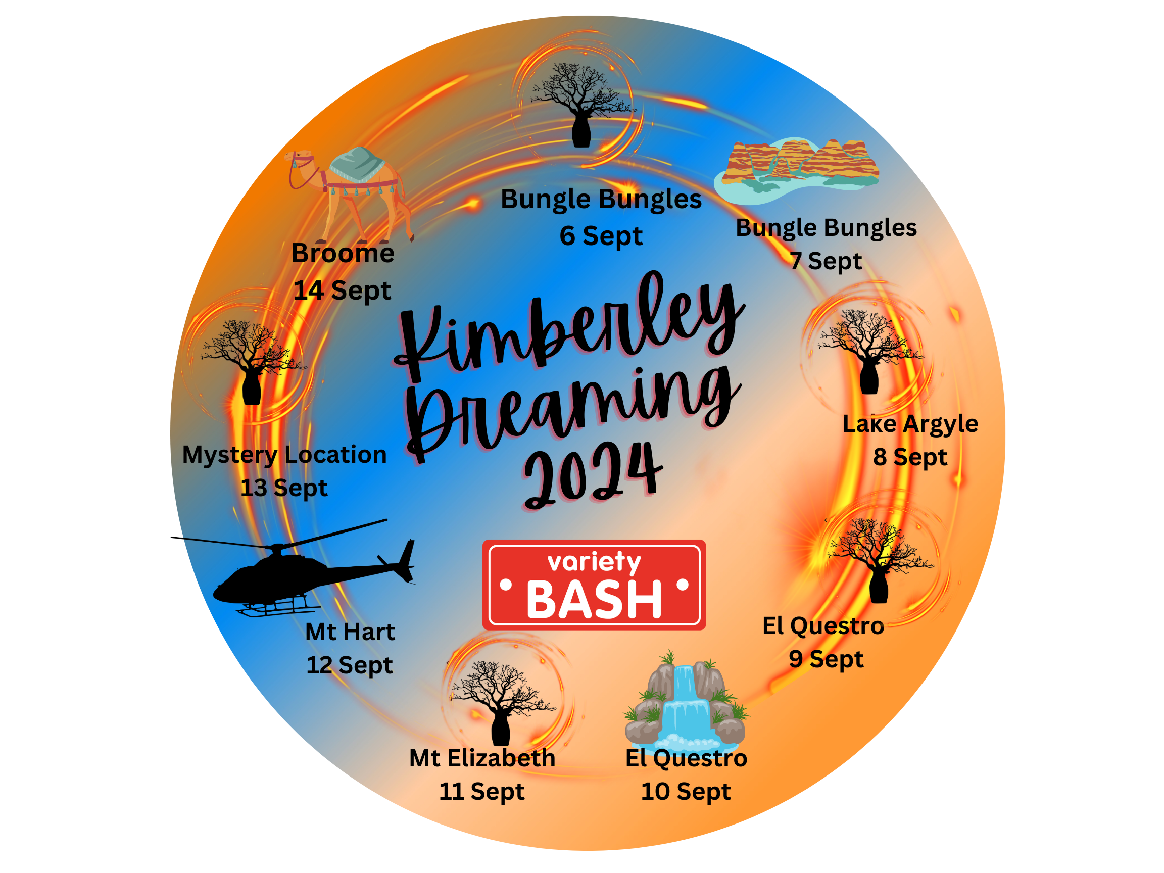The trip kicks off on Friday 6 September and travels from Halls Creek to Lake Argyle to El Questro and Mt Hart finishing up south of the rocks on Cable Beach, Broome on Saturday 14 September.
